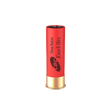 O Cartucho Knock Hex CBC possui balote expansivo fabricado em aço carbono. Uma estrutura de polímero especial envolve o balote impedindo que o aço encoste e danifique o cano da arma e possibilitando o uso em todos os tipos de choke. Sua concepção hexagonal garante máxima transferência de energia para o alvo, sem transfixação ou perda de massa, potencializando o poder de incapacitação do cartucho. O projétil Knock Hex inicia sua expansão instantaneamente no momento do impacto, seguindo na trajetória com progressivo efeito expansivo. A parte central do balote proporciona o choque hidráulico e penetração principais e os seis projéteis que se formam após a expansão inicial, ampliam a efetividade deste extraordinário produto, o troféu de caça maior entre os cartuchos.